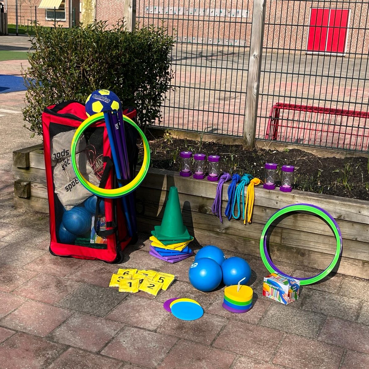 Het Materialenpakket Buitenspeelplan bevat alle benodigde materialen voor het uitvoeren van de buitenspeelactiviteiten. Het pakket sluit volledig aan op de jaarplanning en leskaarten van het Buitenspeelplan.